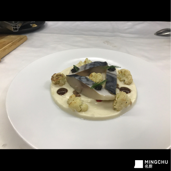 制作花椰菜泥时之所以加入白葡萄酒是因为菜里面搭配了鱼,可以中和鱼腥味,加入鱼籽酱的初衷是让大家在品味花椰菜泥一口丝滑一口爆珠奇妙的口感。腌制的马胶鱼在醋和蔬菜水的浸泡下也使人酸甜开胃,故此道菜品作为开胃菜。下列配方为菜品3人份的量。