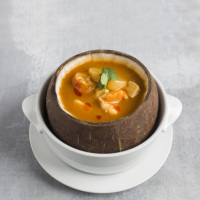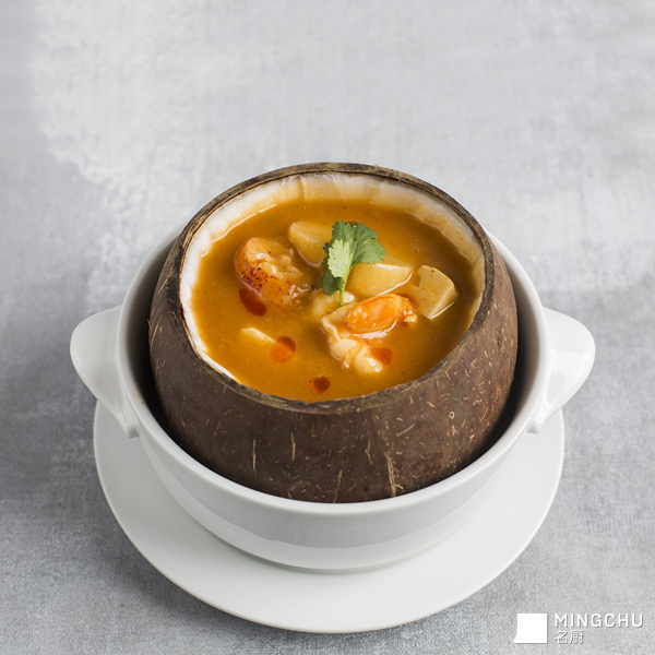 【时令食材】 选用应季的渤海湾海蟹,具有鲜味和甜味。 【研发创意】 海蟹、可持续加拿大带子等海鲜,与老椰子蒸出来的椰香味结合,两种香气相交相融,加上汤汁微酸柔辣,令人胃口大开。出品以椰壳为盛器,颇为环保。 【烹饪关键】 炒香番茄酱时加入面粉炒制,口感更加香醇。新鲜食材,做法简约,烹饪出鲜美滋味和食物本真的味道。