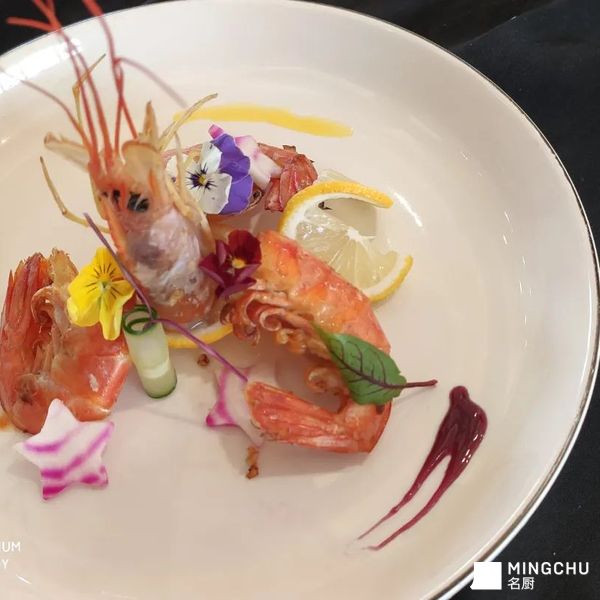 蒜香黄油煎烤阿根廷红虾配三味甜椒酱汁。