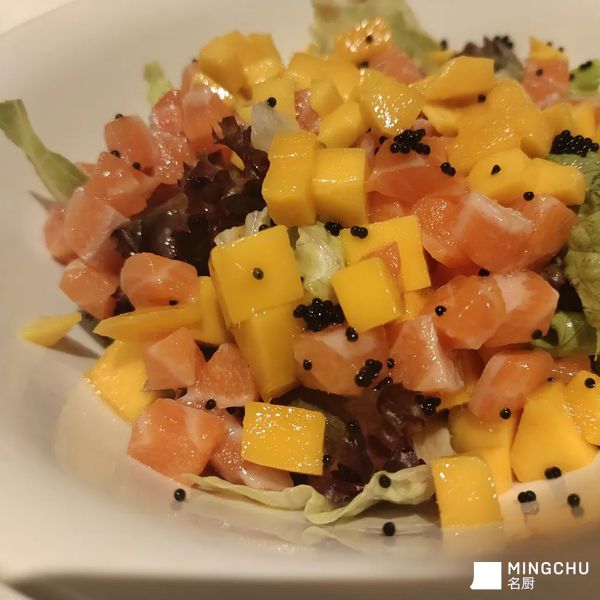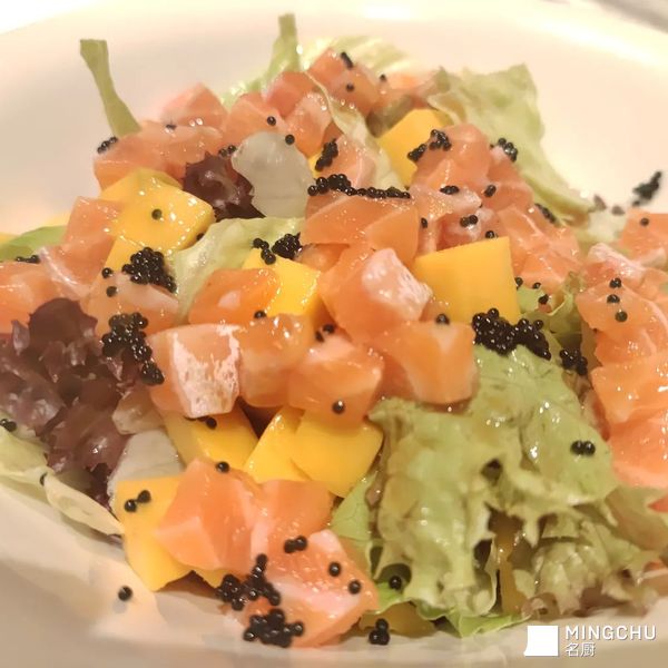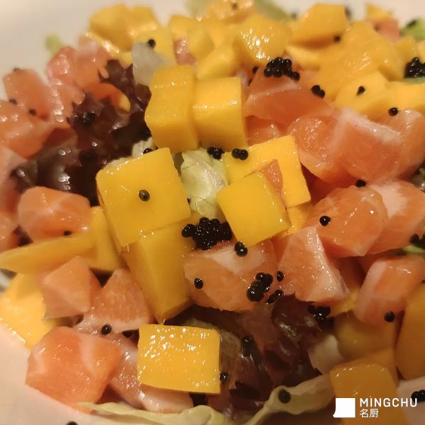 芒果的酸甜加油醋汁的酸咸极大的刺激味蕾,增加了食欲,减少了三文鱼的油腻。