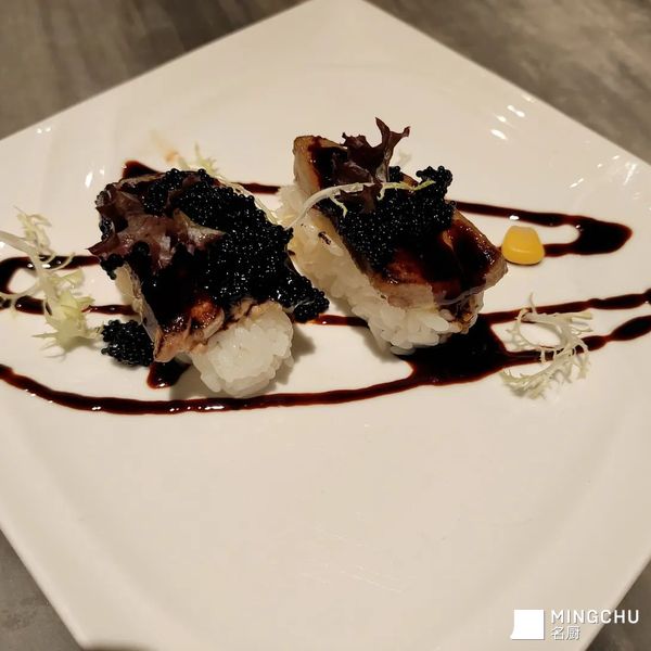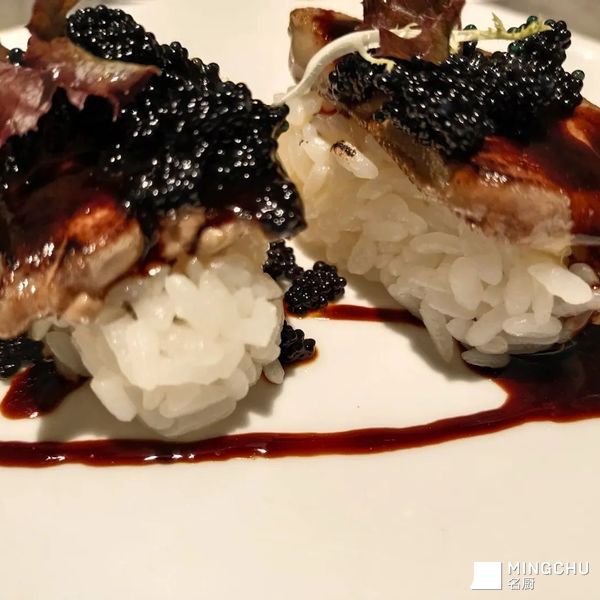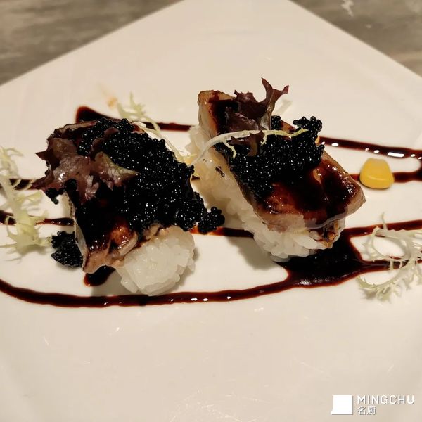 鹅肝的油腻被寿司米饭的酸甜分解,表面撒上黑蟹子,增加在口腔里的独特风味。