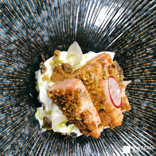 坚果三文鱼配芥末酸奶油