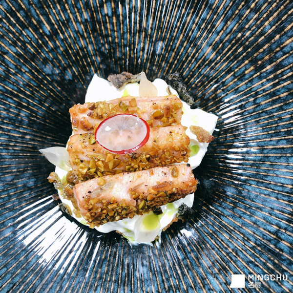 脂香丰富的开心果和三文鱼,配以清新解腻的芥末酸奶油。与脆鱼皮碎、自制莳萝青油、隐藏在下面的土豆色拉。单独食用或拌匀食用皆可