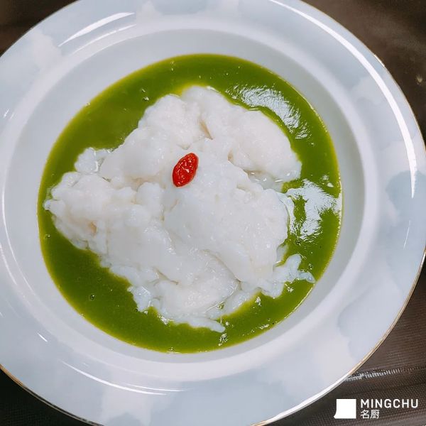 传统鸡豆花为咸鲜味的清鸡汤,加鸡茸。在此基础上用菠菜汁加鸡汤,给视觉反害,增加蔬汁营养。