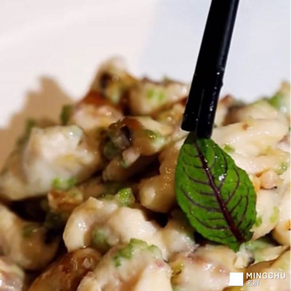 油爆鱼芹是一道传统的鲁菜,选用肉厚质嫩的草鱼,去刺后改一字花刀,便于更好的入味。挂上鸡蓉调制的糊浆,再与五彩末(红火腿末、黑冬菇末、绿芹菜末)拌匀,经油爆而成。 这道菜入口鲜嫩滑爽,回味透出淡雅的芹菜清香。是济南人餐桌上必点的一道菜肴。