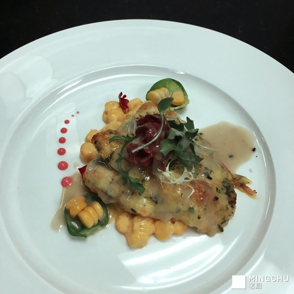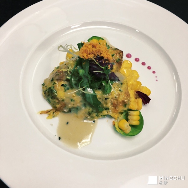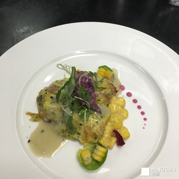 罗勒芝士酱焗鲈鱼佐泰酱咖喱甜玉米莎莎