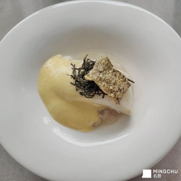 搭配柠檬和百里香蒸制,配以水煮莲藕和块根芹泥,香酥大比目鱼皮&诺丽朱丽安,