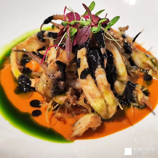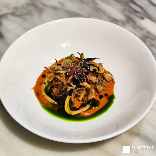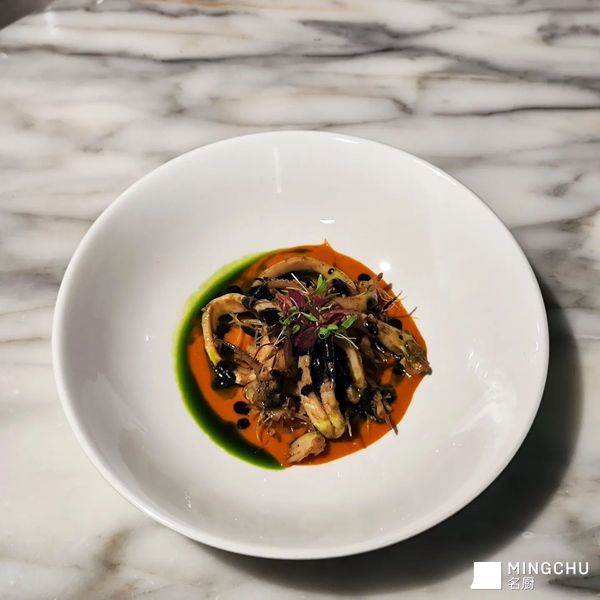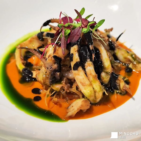 再搭配上芥末石花菜和墨鱼汁 咖喱番茄酱。最后再放一点香草油进行装饰。