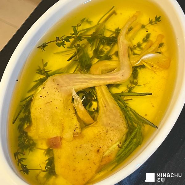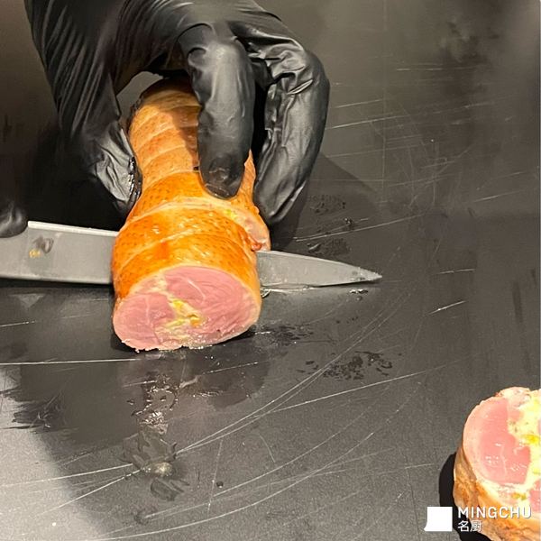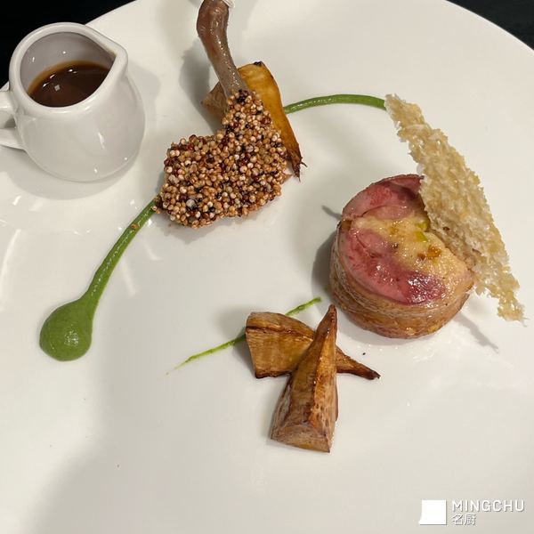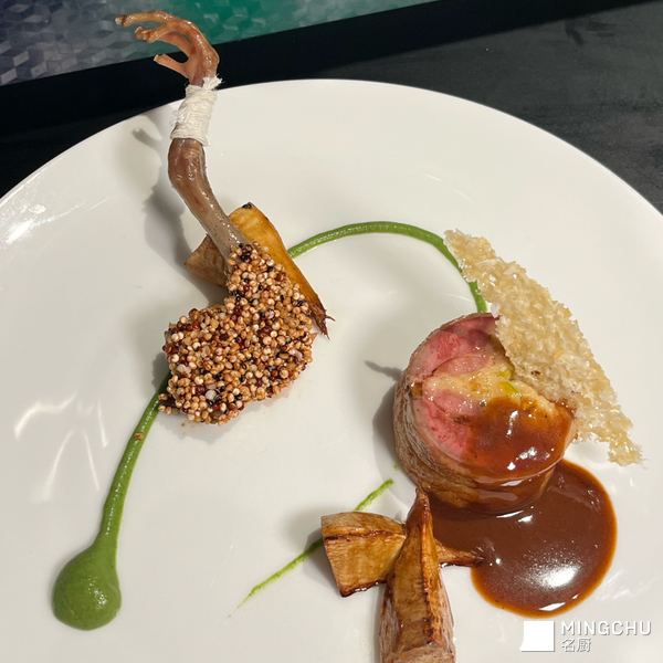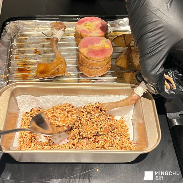一鸽两吃解锁新玩法;鸽胸部分保留完整皮肉,加入慕斯填馅做成法式传统肉卷。低温慢煮后煎制,皮脆肉嫩。鸽腿部分用香料和鸭油封住烤制,裹上脆米口感丰富。希望能给你带来灵感~