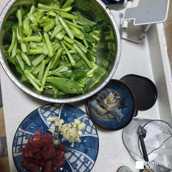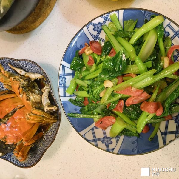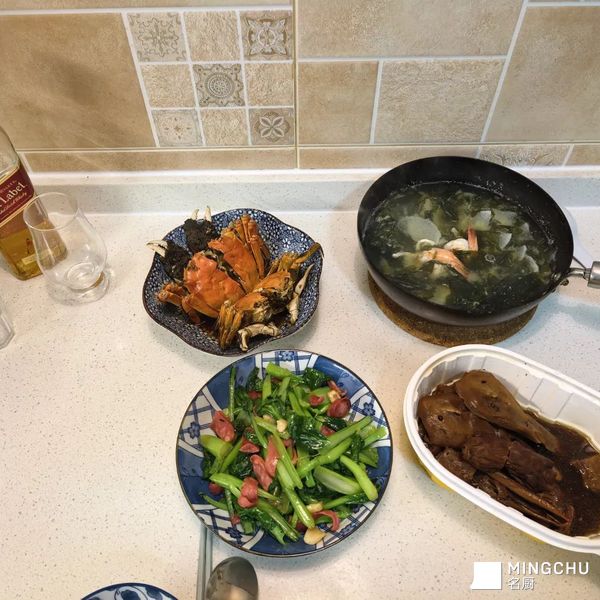 秋冬家庭👪菜单 自制熟醉大闸蟹一对,菜心蒜蓉腊肠炒,鸭货,味增汤白萝卜裙带菜虾仁