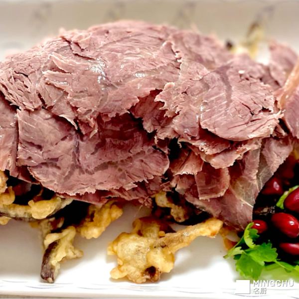 茶树菇天妇罗,上铺削成薄片的牛腱子,花生米香菜点缀在一角。