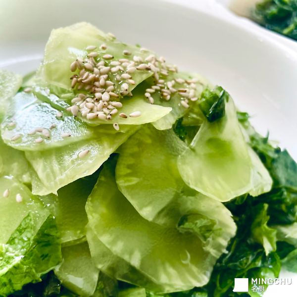 1嫩青皮莴笋/紫皮莴笋均可,嫩叶切小段,少量盐糖腌渍半小时,茎去皮,削薄片,腌渍半小时。
