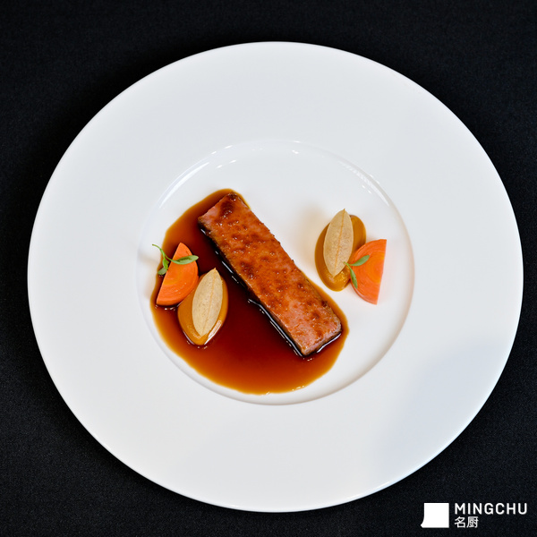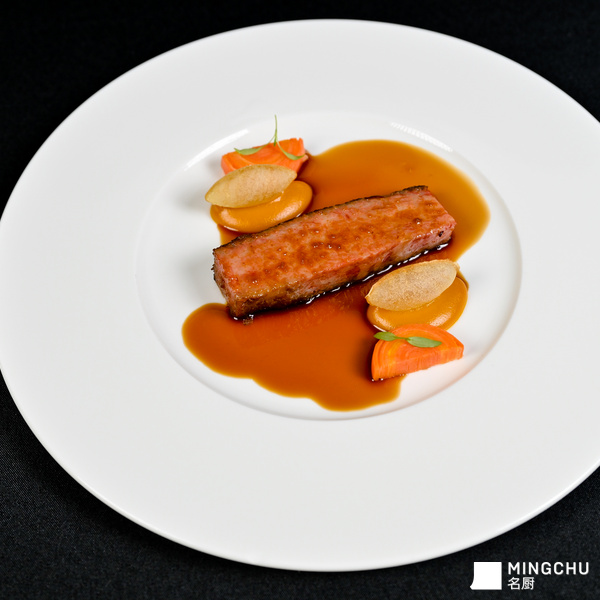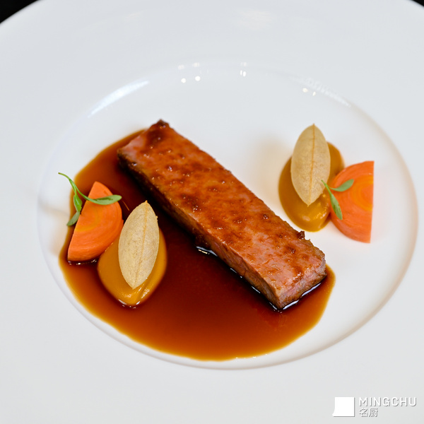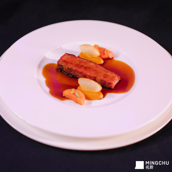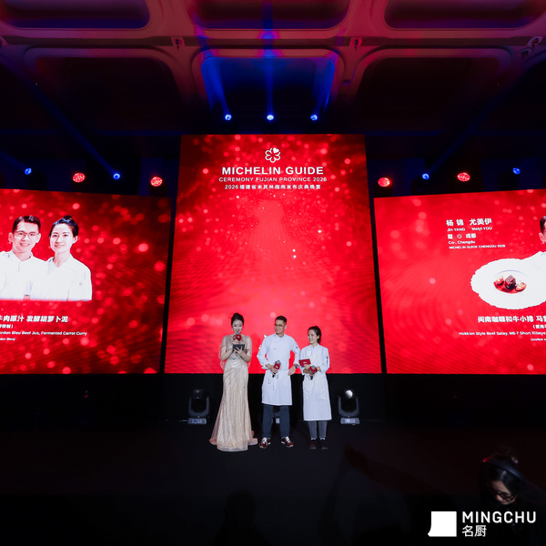2026福建省米其林指南发布庆典现场,特邀成都米其林一星餐厅Co- 主厨 杨锦和尤美伊 带来《闽南咖喱和牛小排 马爹利牛肉原汁 发酵胡萝卜泥》。