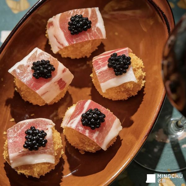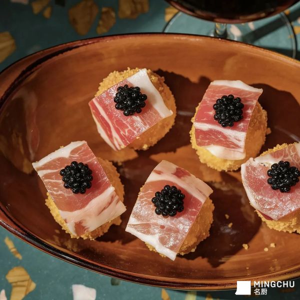 叠上伊比利亚火腿的咸鲜脂香,是对伊比利亚半岛风土的呼应;点睛的鱼子酱,则借其爆破感的鲜味,平衡火腿的醇厚与奶酪的甜润,让一口间同时容纳西班牙乡村的烟火与高端食材的精致,实现传统风味与现代轻奢的融合,像把伊比利亚的阳光与深海的鲜意,封进了一枚迷你的味觉彩蛋里。