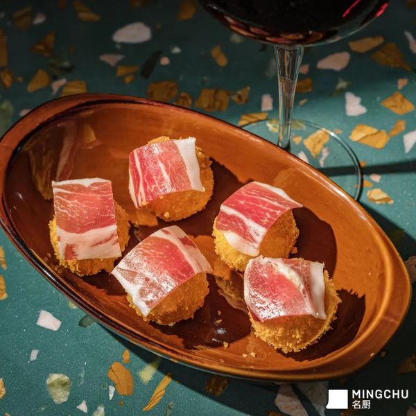 这道菜品的创意灵感,源于伊比利亚火腿与西班牙奶酪的“本土基因”碰撞——以西班牙传统奶酪丸子作基底,裹脆衣炸至金黄,既保留奶酪的绵密奶香,又添酥脆口感。