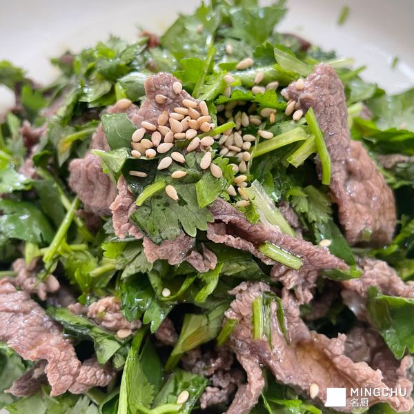 1牛吊龙削成薄片(新鲜吊龙稍微冷冻一小时左右更易削片)2吊龙片用少许生姜胡椒粉食用油抓匀,静置半小时左右3锅内水沸腾分片放入吊龙10秒,肉变色涮熟即可夹出4嫩香菜切碎,与涮熟的吊龙片抓拌5淋上油醋汁,再拌匀,再淋上亚麻籽油,撒上芝麻 粒点缀👌