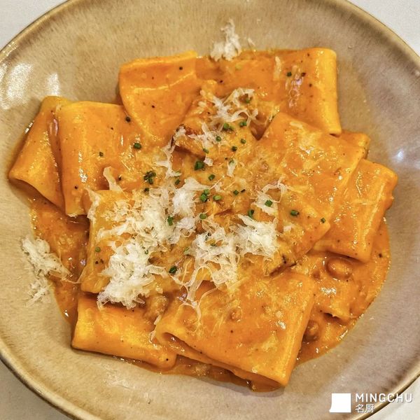 这道甜椒酱意面的创意,源于对意大利南部风味的现代重构。核心灵感取自坎帕尼亚地区经典的罗萨蒂诺甜椒酱,舍弃传统番茄基底的厚重,以烤至焦糖色的红黄彩椒为主角,搭配蒜香与白葡萄酒慢熬出绵密甜润的酱体,中和甜椒的微涩,凸显自然果香。选用宽扁的Paccheri意面,其宽大的面体能牢牢裹住酱体,咬开时酱汁在口腔迸发。最后刨上帕玛森芝士丝,咸鲜的奶香与甜椒的清甜形成层次,再撒入细香葱碎提亮风味,让南意的阳光气息与现代意面的口感平衡相融。