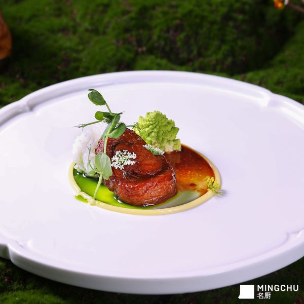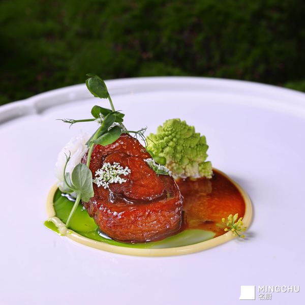 素食也能吃出珍馐级仪式感!精选饱满百灵菇,巧手雕琢成鲍鱼般的精致形态,入锅炸至表皮微焦起皱,瞬间锁住菌菇本身的鲜醇。炒出琥珀色的诱人糖色,下入香叶、桂皮、八角、白芷、草果等香料慢炒出香,再将炸好的百灵菇放入卤汁中慢煨,让每一寸菌肉都充分浸润香料与糖色的复合香气,待卤汁浓稠收汁,百灵菇裹满透亮酱汁,色泽红亮诱人。装盘后点缀几株清新花草,菌香醇厚,口感弹润似鲍,一口下去,尽显中式素食的高阶韵味。