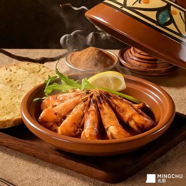 这道菜将摩洛哥传统塔吉锅的“焖蒸锁鲜”与西班牙油浸虾的“油润入味”相结合:
