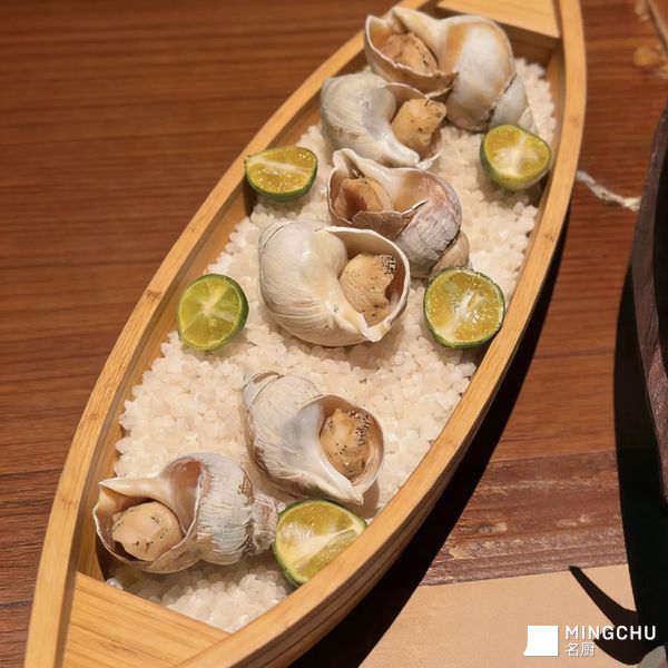 呈现方式:以粗盐为基底、青柠为点缀的极简摆盘,既突出了北俄螺的天然质感,又通过木质船型餐具提升了整体的高级感与仪式感。