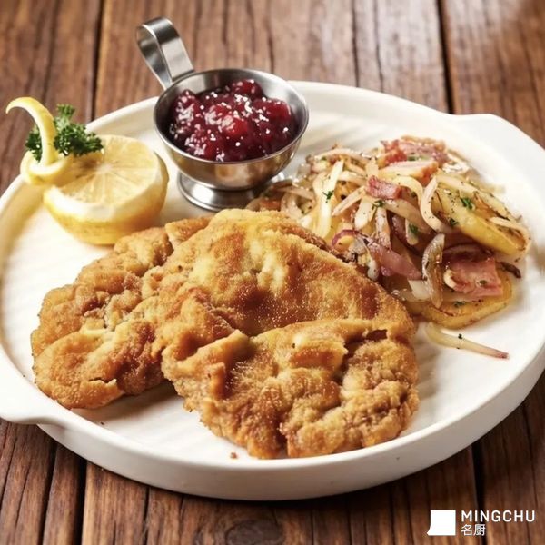 创意理念:以维也纳经典炸牛排为基底,融合现代轻食美学,简化传统工序,保留酥脆外皮与软嫩内里;通过摆盘色彩碰撞(金黄炸衣、鲜红果酱、翠绿柠檬),打造“复古+清新”的视觉味觉双重体验,适配当代精致饮食需求。