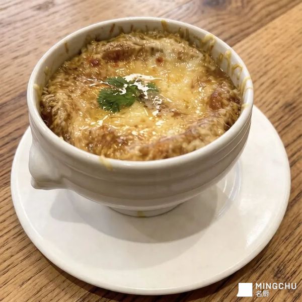 法式洋葱汤以浓郁焦糖洋葱汤为底,覆盖金黄奶酪烤层,口感丰富醇厚。汤体深褐香浓,洋葱软糯带甜,高汤鲜香,奶酪拉丝绵密。热汤融化解腻,表层微焦香脆,整体温暖饱满。是经典法式菜肴,兼具视觉诱人与味觉层次,适合作为开胃汤或主菜搭配面包享用。