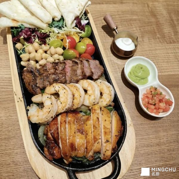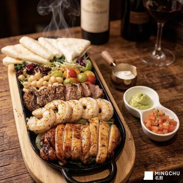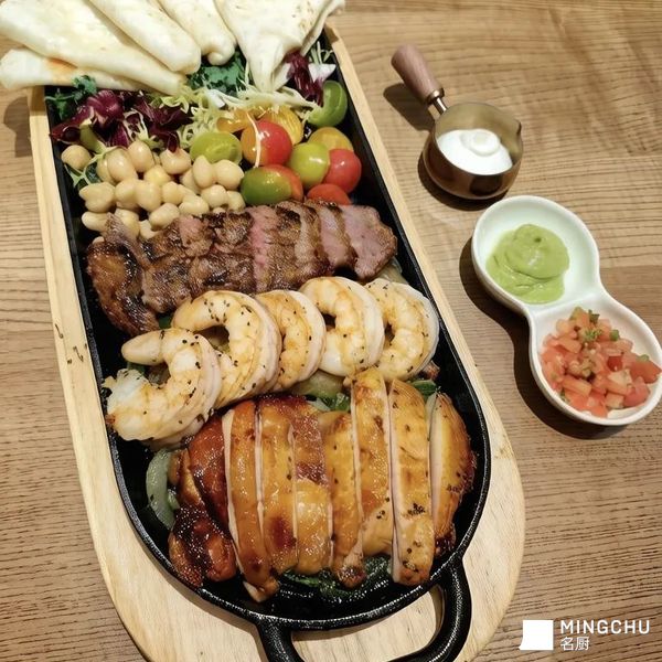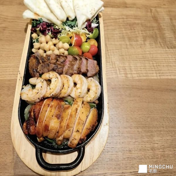 菜品兼具颜值与内涵:造型上,长盘承载多元食材,摆盘错落有致;味觉上,牛排焦香、虾环弹嫩、鲜蔬脆爽,搭配双酱碰撞风味,每口都能体验“肉+鲜+蔬+酱”的复合惊喜,适配分享与精致用餐。