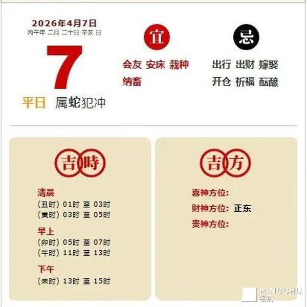 4月7日。宜祭祀 出行 上报告 赴任 亲民 契约 定制 治病 纳畜 栽种 契约 相亲 美容 求子 忌酿酒 嫁娶。鼠宜用心,牛表现佳,虎释然,兔宜接触新事物,龙宜居安思危,蛇宜提神,马宜平和,羊财运佳,猴平顺,鸡宜从容有礼,狗利积极,猪亨,利广结善缘。福祸相依,正复为奇,善复为妖。人之迷,其日固久 一一风水智语