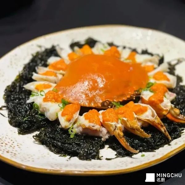 头水紫菜蒸膏蟹,膏蟹肉质嫩白鲜甜,头水紫菜蒸后软嫩滑润,略带嚼劲,吸饱蟹膏和肉汁,鲜香无比。