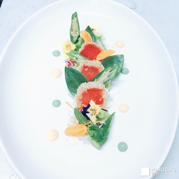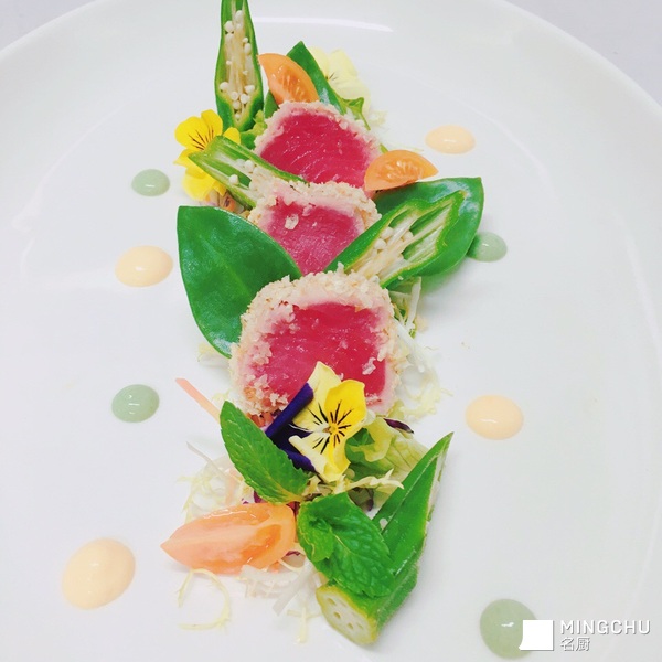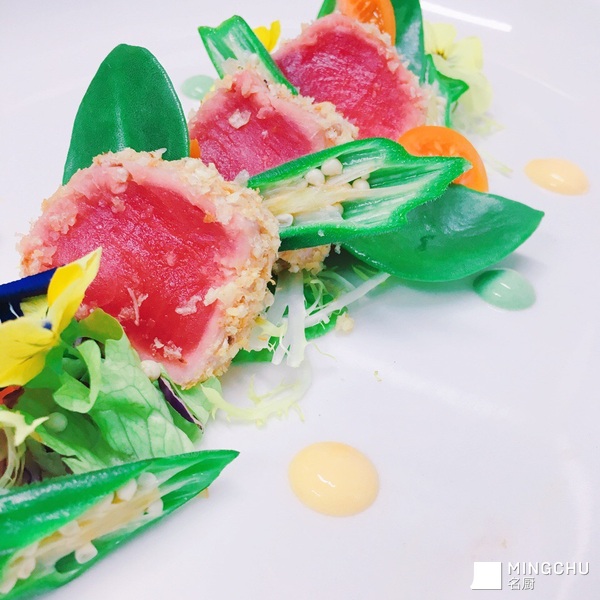 奇奇怪怪味面包糠金枪鱼配生菜沙拉佐菠菜汁和白薯汁