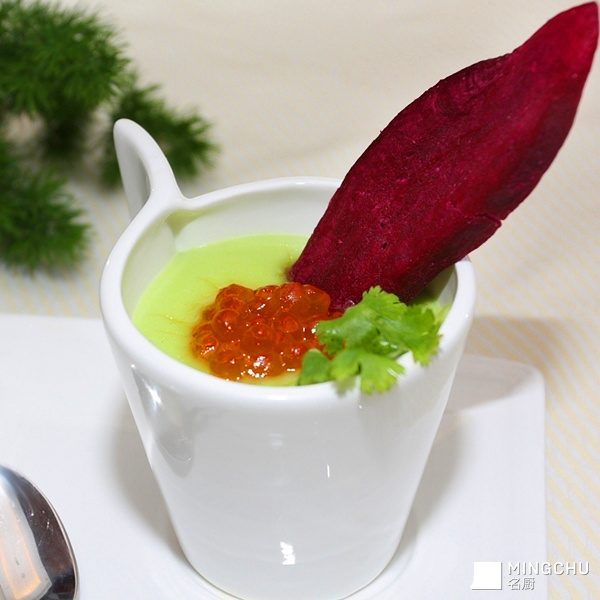 这道汤品用一个精致的小杯子当作容器。汤中的鱼籽会在你口中爆开,香味充满整个味蕾。我在上海超过100年的七宝老街发现了炸紫薯,很有创意也很美味。于是我运用到了这道菜品中。如果在超市能找到售卖的海水,用它代替常规水,省略配方中的海盐。记住煮汤时用冷水,这样才能激发出每种食材的精华。