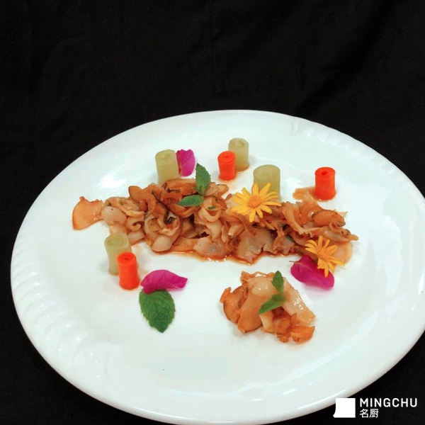 此原料肉质脆嫩,饱满,在焯水时掌控水温和焯水时间,保证肉质脆嫩,冰镇目的也是为了使其肉质脆嫩爽口。