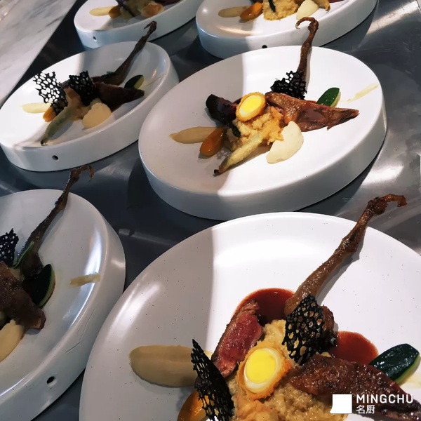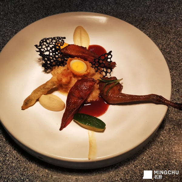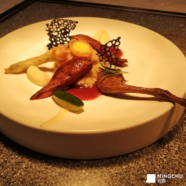 Pigeon with quinoa risotto, confit leg with celery purée,quail egg and vergetable tempura with grapes pigeon jus