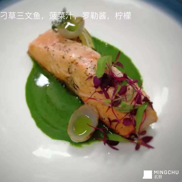 低温三文鱼,菠菜汁,营养健康的一道美食