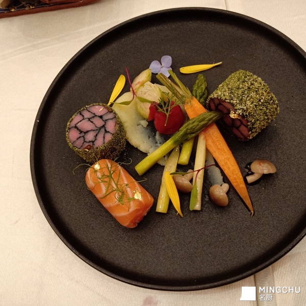 大理石牛柳配时蔬 三文鱼卷