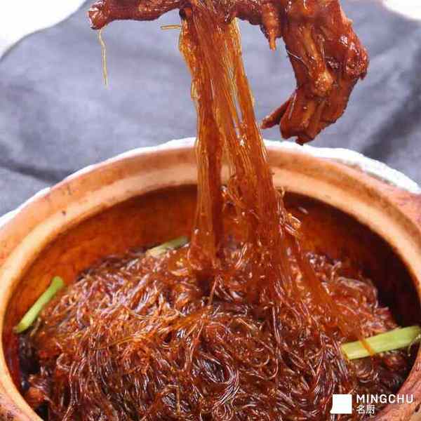 此菜需经过卤、煲、捞三步完成:首先,鹅掌要加鸡汤卤,还要放入大量蒜瓣以及本地的中坝口蘑酱油提鲜去腥;其次,鹅掌和粉丝要放入砂锅,加原汤及花雕酒加盖煲;最后,在煲的同时,每隔1分钟要打开盖子,用筷子捞拌粉丝,帮助其均匀受热。