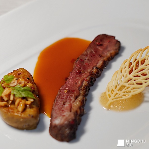 #2020广州米其林指南晚宴 #晚宴 #广州 #鸭胸 #鸭肝主理广州四季酒店佰鲜汇的主厨曾志仁带来了另外一道主菜,菜品由三部分共同构成。其一是经过煎制后的鸭肝,薄薄的外壳下是细腻的内里,肥而不腻。其二是薄切的鸭胸肉块,表皮已经煎烤至微焦,搭配咸鲜微甜的焦糖味噌汁,更可提升风味。最右侧是以模具制成的树叶脆片,搭配糖渍雪梨一同享用,与鸭胸与鸭肝的咸鲜达成风味的平衡。