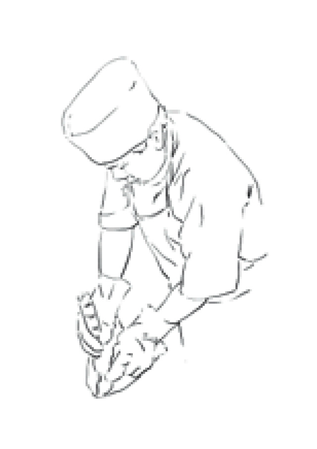 负责鱼类、海鲜的屠杀及清洗,帮助厨师预备材料。