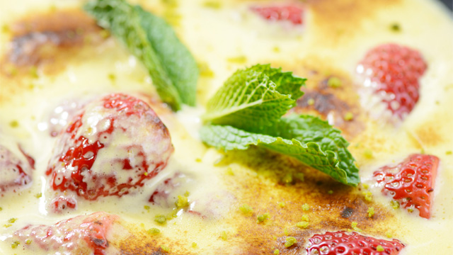5.把第一步制成的奶油蛋羹铺在碟子上,放上腌制好的草莓、浇上奶油沙司。撒上糖霜,使用喷火枪烘成漂亮的金黄色;