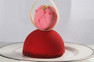 北京华尔道夫酒店饼房厨师长田萍创新选择加入树莓果蓉首先是因为它靓丽的色彩,可以中和可可粉的暗色调,其次则是口味,亚洲人不太能接受特别甜的口味,而红丝绒偏偏又是糖量不小的甜品,因此树莓的酸甜味道正好能让在口感上降低甜度。