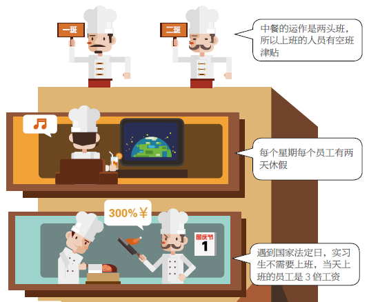 A:全日餐的早餐,午餐,晚餐菜单,星期六日海鲜自助,艳的客户和特殊要求菜单,中餐宴会的菜单和运作,人手的配置。