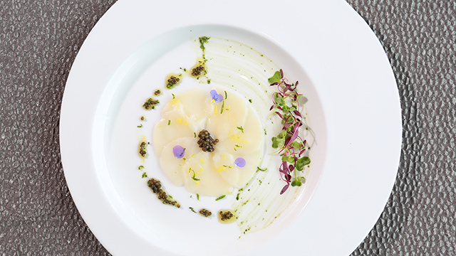 1.选取口感爽嫩的北海道带子搭配晶莹剔透的“西伯利亚鲟鱼子”,入口滋味纯正,回味清淡爽口
