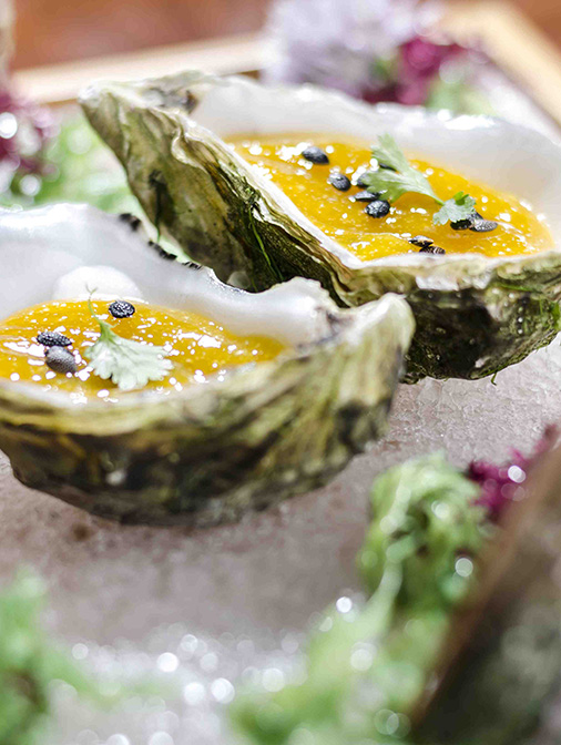 做法:开蚝,清洁并过滤一下,纸巾吸干水,用热情果啫喱酱汁包起;清洁热情果籽粒,煮熟后弄干,过滤出剩余的部分,入保温柜;蚝壳里放些奶油,蚝肉放上面,再放些香菜碎和热情果籽粒。