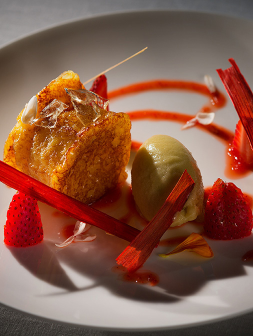 A:这道菜把所有的原料放在一起,加入泡打粉后放在发泡器里,让食材之间充分混合接触空气。液氮的加入也是为了发泡。这样处理后的食材放在微波炉里就非常容易成型,出品上会有如海绵状的表面,充满小孔,都是空气进入的结果,口感非常松软。在大黄的处理上,为了制作薄脆的口感,食材需要低温烘干,或者室外风干,都是与空气接触而完成的。