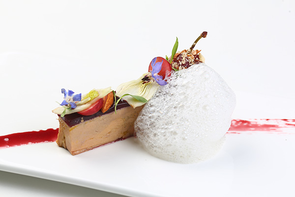 菜品2: 这道菜的基础是法国的一个经典:鹅肝酱。樱桃和茴香的关联是杜主厨从一位在法国诺曼底的两星级米其林餐厅的厨师那儿学的。