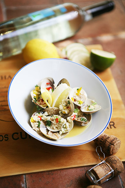 炒香蒜茸,放入文蛤、棋子干白葡萄酒,酒水没过文蛤的一半,水蒸气出来后闷制,过程中会有部分酒精挥发,热气至使文蛤开口,留下酒香。烹饪中结合了“炒、烩、蒸”三种烹饪方法。