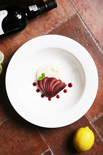 3) 将米饭布丁放入盘中,并放入煮好的红酒梨即可。