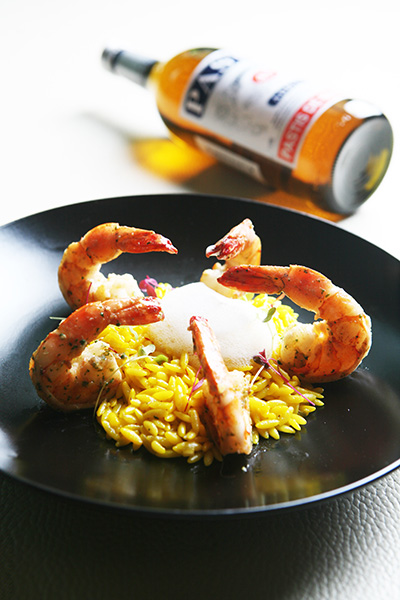 做法:鸡汤煮开加入藏红花煮5分钟,加入米形意面煮至“al dente”;将大蒜、红葱头、欧芹混合与黄油调匀,待用;洗净老虎虾,去除头和外壳,待用;取锅加橄榄油,将虾入锅烹制,出锅前加调制黄油;在虾上倒茴香酒,点燃,待火熄出锅;用牛奶和帕玛森奶酪调制乳液,淋在虾上。