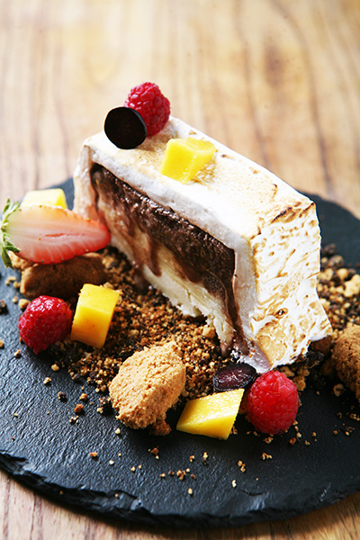 装盘前从冰箱取出凝胶冰激凌卷,切段,宽约4厘米;取少许曲奇碎或蛋糕装饰香酥粒垫在盘底,再放上冰淇凌卷(这样不止丰富口感层次,也可以防止融化后冰激凌卷在盘子里打滑);用刮刀或小勺在冰激凌卷上加一层瑞士蛋白霜,上桌前用喷枪烤至金黄;在金属碗中倒入烈性酒,用蒸汽加热器加热,点火,用长柄勺小心地将燃烧的酒倒在甜品上,15秒钟火焰熄灭,马上上桌。