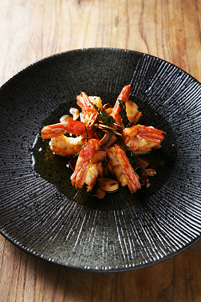 这款酒是由一半西班牙白兰地和一半法国干邑混合放入酿造过雪莉酒的橡木桶里陈酿18个月而成。干性的白兰地浓烈少糖,让这道前菜清爽不腻;吸收了雪莉酒风味而变得甜美的酒液,让虾肉更加芬芳鲜甜。